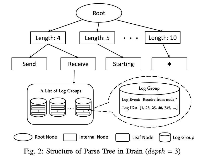 The Drain algorithm relies on a key data structure: a parse tree (i.e., a prefix tree). The nodes can be categorized as follows.